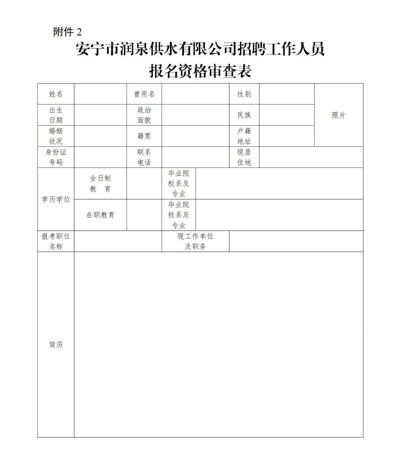2.安寧市潤(rùn)泉供水有限公司招聘工作人員報(bào)名資格審查表