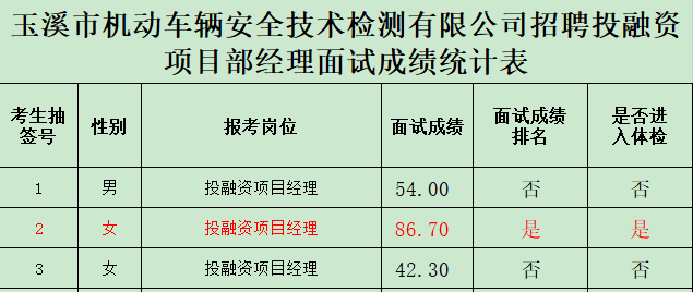 玉溪市機動車輛安全技術檢測有限公司招聘投融資項目部經理已于2024年2月23日開考并順利結束,共3人報名,3人參加面試,擬錄用1人,現(xiàn)將面試成績、進入體檢人員名單及體檢相關事宜公布如下:
