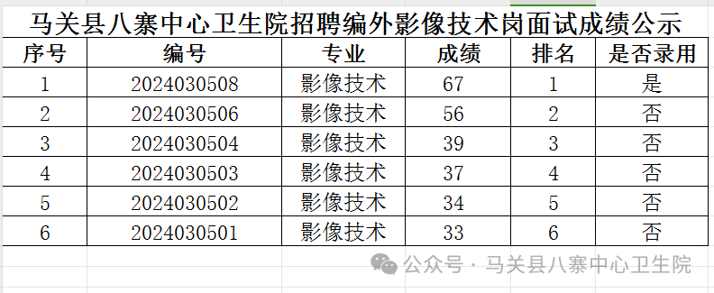 根據(jù)《馬關(guān)縣八寨中心衛(wèi)生院招聘編外醫(yī)學(xué)影像技術(shù)人員通告》有關(guān)規(guī)定,現(xiàn)將馬關(guān)縣八寨中心衛(wèi)生院2024年3月公開招聘編外影像技術(shù)人員面試成績予以公示: