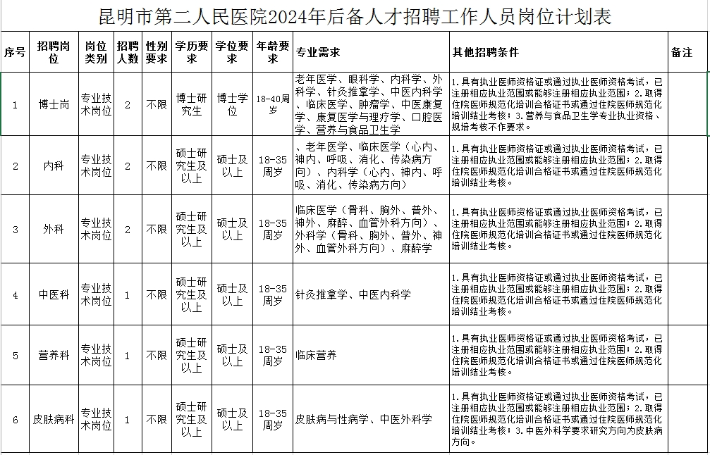 本次共招聘9人。具體招聘崗位及招聘條件詳見(jiàn)《昆明市第二人民醫(yī)院2024年后備人才招聘工作人員崗位計(jì)劃表》(以下簡(jiǎn)稱《崗位計(jì)劃表》),可通過(guò)昆明市衛(wèi)生健康委員會(huì)官網(wǎng)(wsjkw.km.gov.cn)、昆明衛(wèi)生人才網(wǎng)(www.kmwsrc.com.cn)查詢?cè)敿?xì)信息。