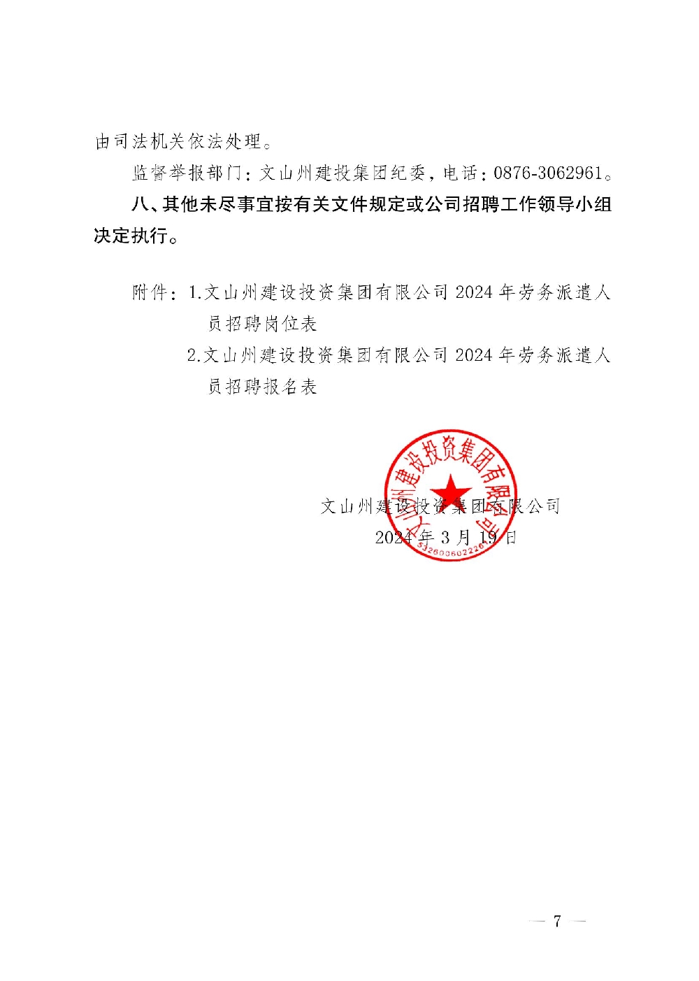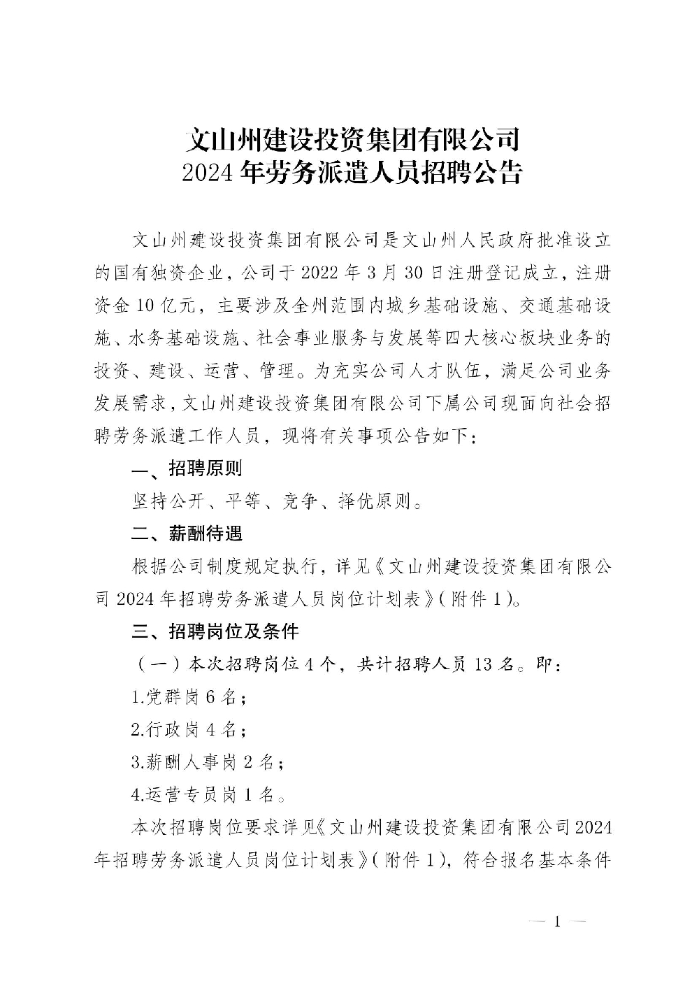文山州建設(shè)投資集團有限公司 2024年勞務派遣人員招聘崗位表 |