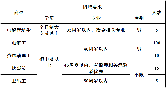 1、試用期三個月,電解工崗位試用期工資4000-5000元。其他崗位試用期工資執(zhí)行崗位工資的80%;試用期過后,根據(jù)個人崗位勝任度執(zhí)行崗位工資。所有招聘崗位,試用期內(nèi)不享受各項(xiàng)補(bǔ)貼。