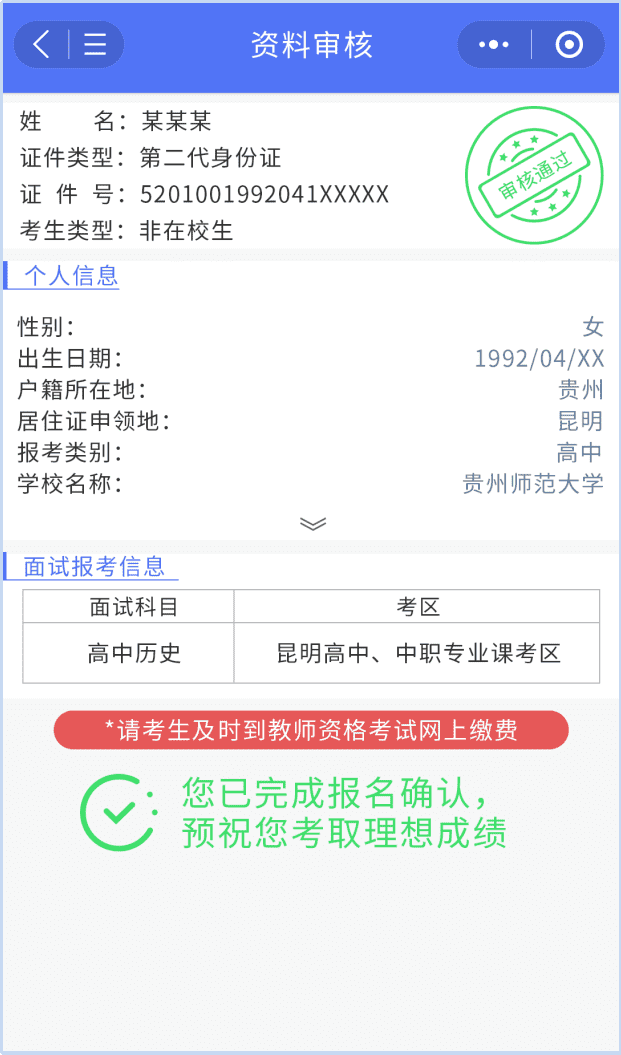 審核結(jié)論為“審核通過(guò)”且結(jié)論已同步至中小學(xué)教師資格考試網(wǎng)的考生需前往中小學(xué)教師資格考試網(wǎng)ntce.neea.edu.cn進(jìn)行繳費(fèi)。繳費(fèi)完成后,面試報(bào)名方能成功。