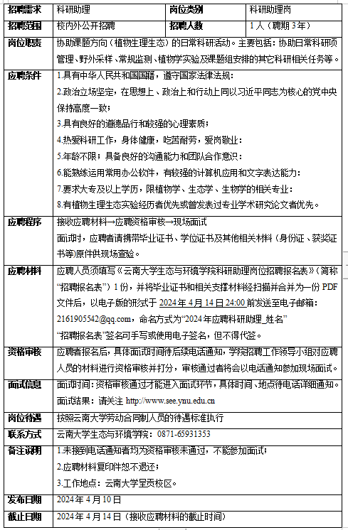 2024年云南大學生態(tài)與環(huán)境學院科研助理崗位招聘公告