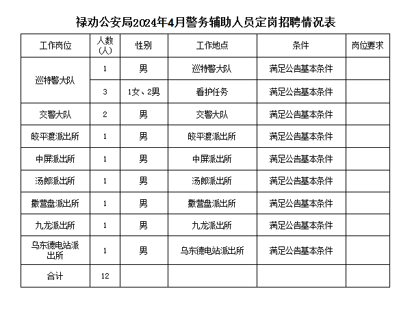本次招聘為勞務(wù)派遣用工性質(zhì),共招聘12人,實行勞動合同制管理,崗位為祿勸彝族苗族自治縣公安局勤務(wù)輔警,不納入編制管理,不具有人民警察身份,不行使人民警察職權(quán),主要負責(zé)協(xié)助公安民警開展治安巡邏、應(yīng)急處突、非涉密性行政事務(wù)和公共服務(wù)管理等工作。具體招聘崗位需求見附件1《祿勸彝族苗族自治縣公安局2024年4月警務(wù)輔助人員定崗招聘情況表》。