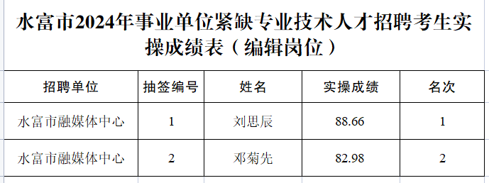 根據(jù)《昭通市2024年事業(yè)單位公開招聘優(yōu)秀緊缺專業(yè)技術(shù)人才實(shí)施辦法》和《水富市2024年事業(yè)單位公開招聘優(yōu)秀緊缺專業(yè)技術(shù)人才通告》的有關(guān)要求,水富市2024年事業(yè)單位公開招聘優(yōu)秀緊缺專業(yè)技術(shù)人才實(shí)操工作已于4月28日上午完成,現(xiàn)將實(shí)操成績予以公示,公示期為5個工作日。