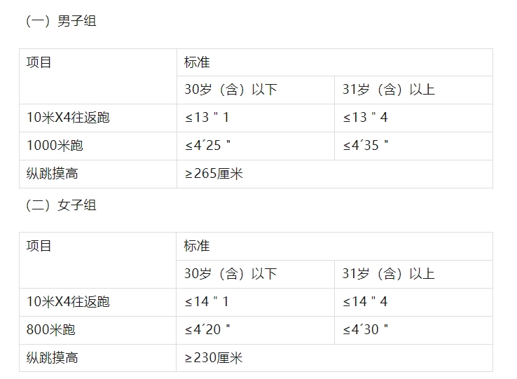 備注:凡應測項目中任意一項不達標的,即為體能測評不合格。