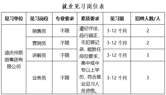 迪慶州旅游集團(tuán)設(shè)置就業(yè)見習(xí)崗位10個(gè),擬招聘青年就業(yè)見習(xí)人員10人(詳見下表)。