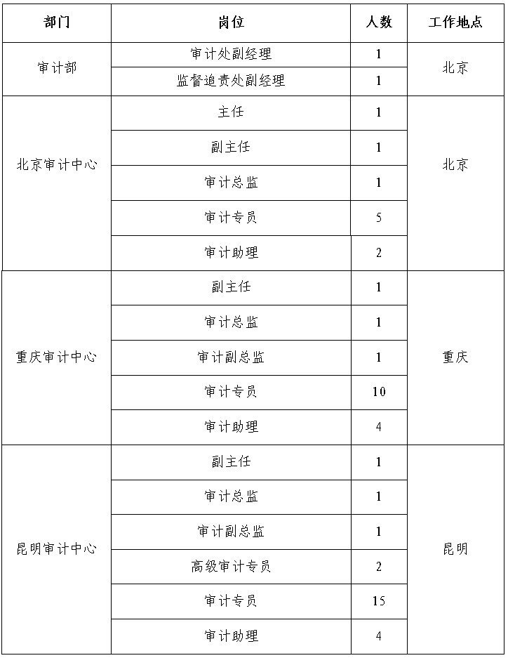 根據(jù)工作需要,經(jīng)研究決定,現(xiàn)面向社會(huì)公開招聘方式補(bǔ)充集團(tuán)總部、有關(guān)單位審計(jì)人員65人?,F(xiàn)將有關(guān)事項(xiàng)公告如下: