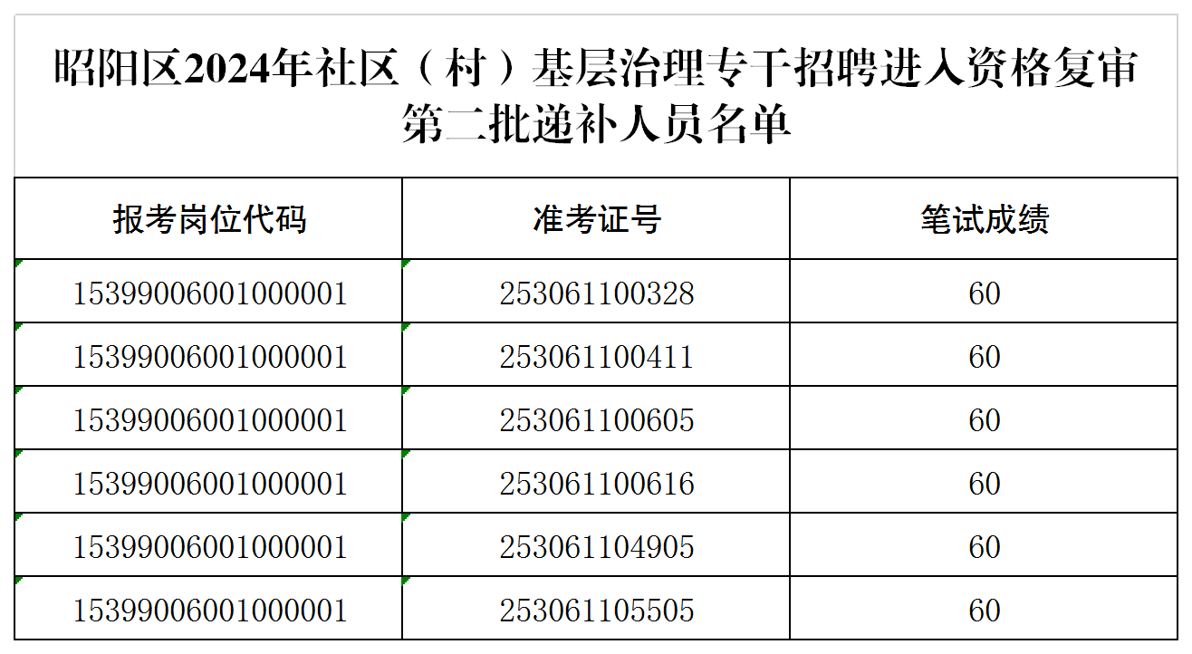 根據(jù)云南省2024年社區(qū)(村)基層治理專干招聘工作有關(guān)要求,昭陽(yáng)區(qū)資格復(fù)審第一次遞補(bǔ)工作已結(jié)束,因部分考生自動(dòng)放棄資格復(fù)審或資格復(fù)審不合格,需進(jìn)行第二次遞補(bǔ)。現(xiàn)將遞補(bǔ)人員資格復(fù)審相關(guān)事項(xiàng)公告如下: