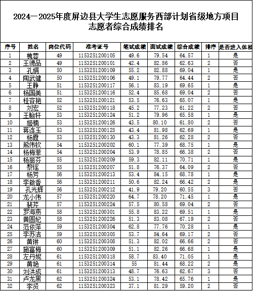 根據(jù)《紅河州2024—2025年度大學(xué)生志愿服務(wù)西部計(jì)劃地方項(xiàng)目志愿者招募公告》工作安排,屏邊縣大學(xué)生志愿服務(wù)西部計(jì)劃項(xiàng)目管理辦公室遵循公平、公正、公開的原則,于2024年6月28日順利完成面試工作。現(xiàn)將綜合成績及擬進(jìn)入體檢人員名單予以公示,公示時(shí)間從2024年6月29日起至7月3日止。