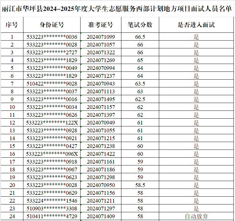 根據(jù)麗江市西部計劃項目辦關(guān)于開展2024-2025年度云南省大學生志愿服務(wù)西部計劃省級地方項目的有關(guān)要求,按報考崗位根據(jù)筆試成績從高到低的順序,以招考計劃數(shù)1:2的比例,確定參加面試人選,現(xiàn)將面試有關(guān)事項公告如下: