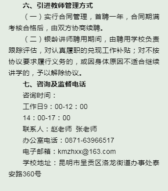 昆明市中華小學教育集團成立于2019年12月,以昆明市中華小學為龍頭學校,目前一校十址。依據(jù)《中共昆明市委辦公室 昆明市人民政府辦公室關于印發(fā)<昆明市銀齡講學三年行動計劃(2021—2023年)>的通知》(昆辦通〔2021〕6號),為深入推進昆明市中華小學教育集團的核心競爭力,提升教育集團的教育教學質量,昆明市中華小學教育集團2024年計劃引進銀齡講師若干名,并常年引進銀齡講師?,F(xiàn)將有關事宜公告如下: