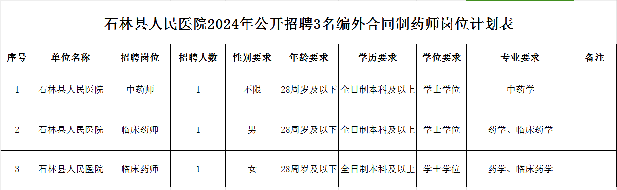 面向社會(huì)公開招聘普通招生計(jì)劃全日制學(xué)歷并符合招聘條件及崗位條件的人員,具體要求詳見《石林縣人民醫(yī)院2024年公開招聘3名編外合同制藥師崗位計(jì)劃表》(附件1)。年齡等相關(guān)年限計(jì)算時(shí)間截止至2024年7月31日。