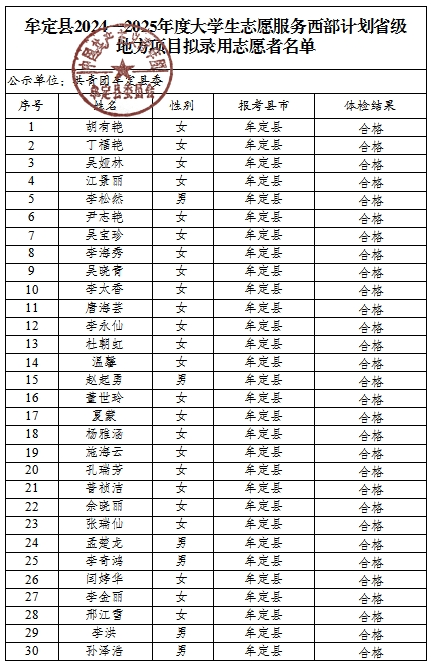 牟定縣2024—2025年度大學(xué)生志愿服務(wù)西部計(jì)劃省級(jí)地方項(xiàng)目擬錄用志愿者名單公示