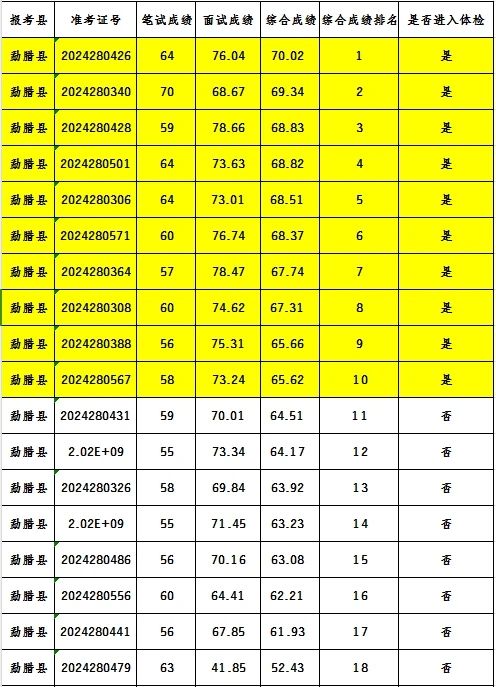 勐臘縣2024—2025年度大學(xué)生志愿服務(wù)西部計劃地方項目招募擬進入體檢人員名單根據(jù)報考者綜合成績從高到低的順序,按招募崗位1:1的比例來確定(綜合成績計算方法:綜合成績=筆試成績50%+面試成績50%)。名單如下: