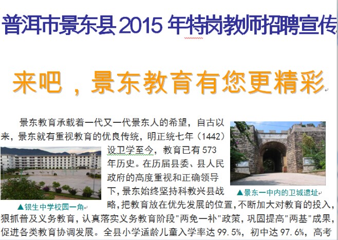 普洱市景東縣2015年特崗教師招聘宣傳