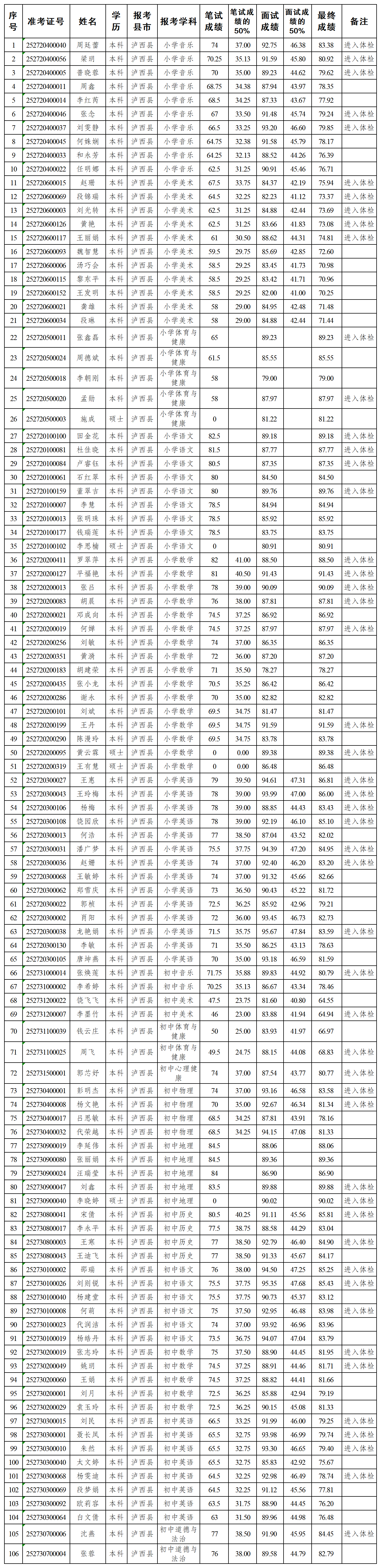 按照《紅河州教育體育局關(guān)于2024年特崗教師招聘考試的公告》《紅河州2024年中央特崗教師招聘資格復審及面試公告》要求,瀘西縣2024年中央特崗教師招聘工作于2024年8月1日按照面試程序和要求已全部結(jié)束,現(xiàn)將瀘西縣2024年中央特崗教師招聘成績以予公告如下: