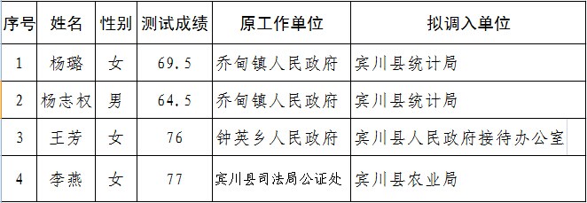 根據(jù)《賓川縣縣直機(jī)關(guān)公開(kāi)選調(diào)公務(wù)員暫行辦法》和《關(guān)于認(rèn)真做好2014—2015年縣直機(jī)關(guān)公開(kāi)選調(diào)公務(wù)員的通知》規(guī)定,經(jīng)基礎(chǔ)知識(shí)測(cè)試、用人單位考察和縣政府審批,現(xiàn)將第三批擬調(diào)動(dòng)人員情況公示如下: