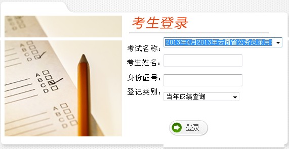 登錄報(bào)名網(wǎng)站云南人事考試網(wǎng),網(wǎng)址為:www.ynrsksw.cn、www.ynrsksw.net或www.ynrsksw.com(登錄任意一個(gè)網(wǎng)址均可查詢)。如下圖所示,在首頁(yè)的右側(cè)點(diǎn)擊“成績(jī)查詢”,選擇2013年公務(wù)員考試,在“登記類別”欄選擇“當(dāng)年成績(jī)查詢”,輸入“考生姓名”及“身份證號(hào)”,即可查詢本人各科的詳細(xì)成績(jī)。