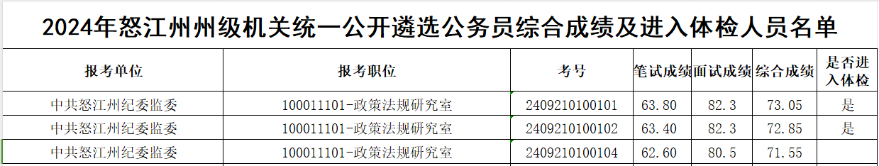 2024年怒江州州級機關(guān)統(tǒng)一公開遴選公務(wù)員綜合成績和進入體檢情況公示