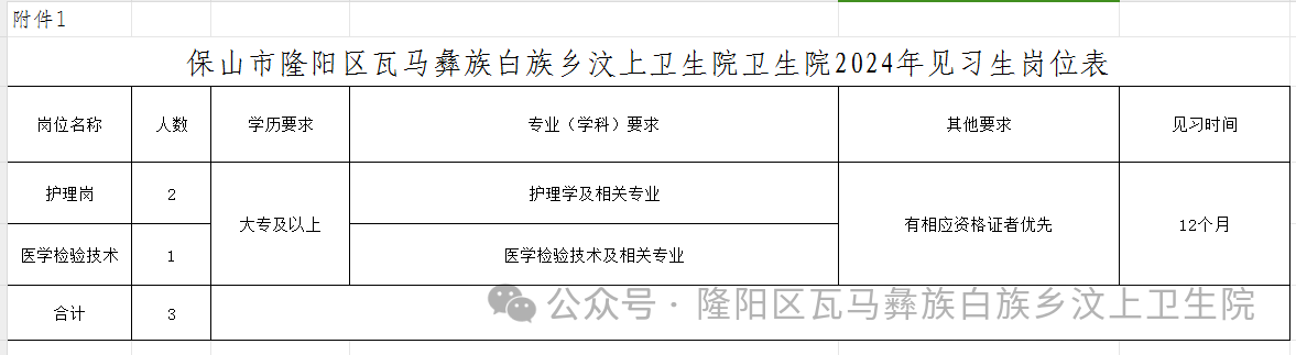附件1:保山市隆陽(yáng)區(qū)瓦馬彝族白族鄉(xiāng)汶上衛(wèi)生院衛(wèi)生院2024年見習(xí)生崗位表