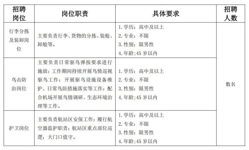 根據(jù)工作需要,公司決定面向社會(huì)公開(kāi)招聘迪慶香格里拉機(jī)場(chǎng)網(wǎng)點(diǎn)行李分揀及裝卸員、護(hù)衛(wèi)員、鳥(niǎo)擊防治員等?,F(xiàn)將招聘內(nèi)容公告如下: