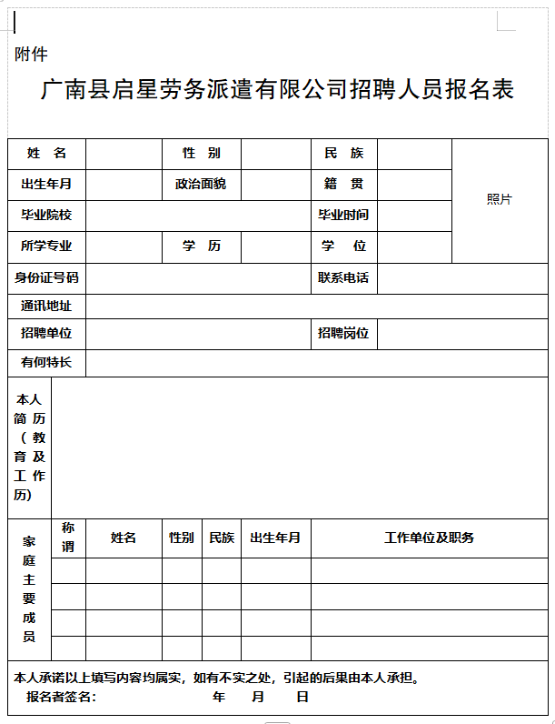 附件:廣南縣啟星勞務(wù)派遣有限公司招聘人員報名表