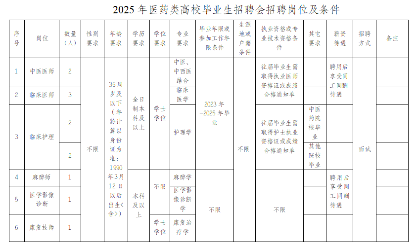因醫(yī)院業(yè)務(wù)發(fā)展需要,結(jié)合醫(yī)院實(shí)際,參加云南省衛(wèi)生健康委云南省教育廳關(guān)于聯(lián)合舉辦云南省2025年醫(yī)藥類高校畢業(yè)生招聘會(huì)(云南中醫(yī)藥大學(xué)、昆明醫(yī)科大學(xué)、昆明醫(yī)科大學(xué)海源學(xué)院),面向醫(yī)藥類高校應(yīng)往屆畢業(yè)生公開(kāi)招聘12名中醫(yī)學(xué)、臨床醫(yī)學(xué)、麻醉學(xué)、護(hù)理學(xué)、醫(yī)技類專業(yè)編制外合同制專業(yè)技術(shù)人員,現(xiàn)將招聘有關(guān)事項(xiàng)公告如下: