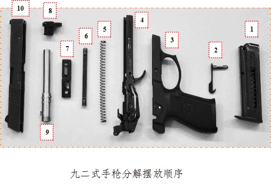 92式9mm手槍的分解結(jié)合及槍支部件的擺放標(biāo)準(zhǔn)如下: