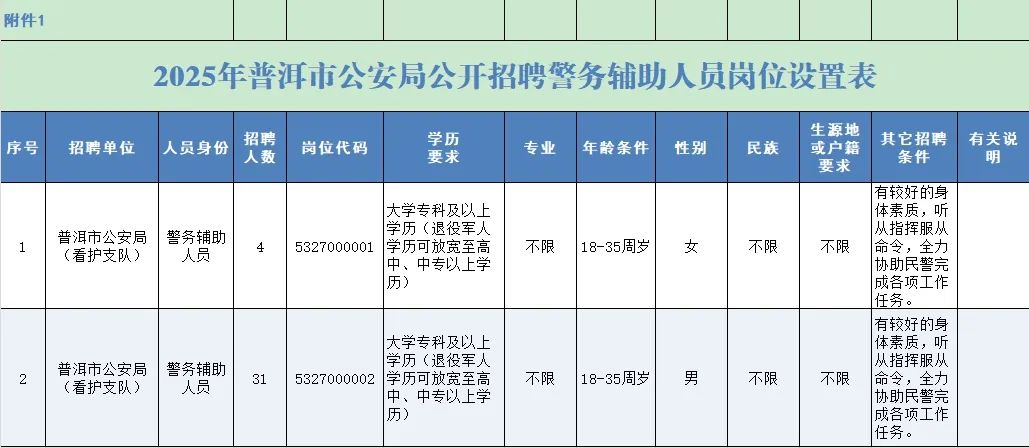 附件: 1.2025年普洱市公安局公開招聘警務輔助人員崗位設置表