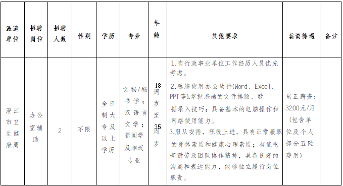 澄江市衛(wèi)生健康局因工作需要,委托澄江市啟澄人力資源有限責(zé)任公司,面向社會公開招聘行政輔助工作人員2名, 現(xiàn)將有關(guān)事項公告如下: