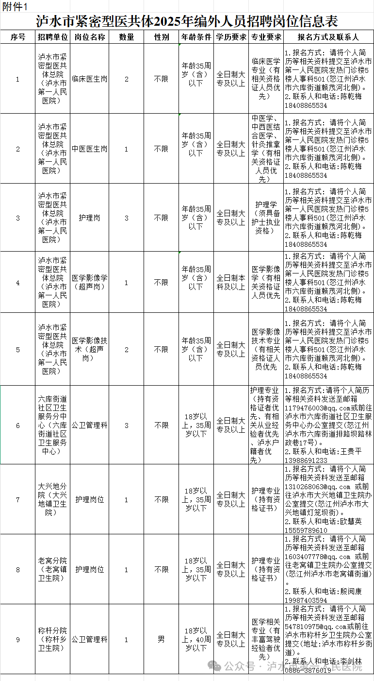 2.分院現(xiàn)場/線上報名:詳見《瀘水市緊密型醫(yī)共體2025年編外人員招聘崗位信息表》。