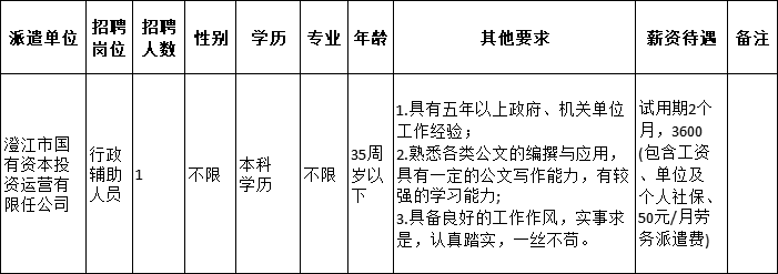 澄江市國有資本投資運營有限責(zé)任公司因工作需要,委托澄江市啟澄人力資源有限責(zé)任公司面向社會公開招聘行政輔助人員1名,現(xiàn)將有關(guān)事項公告如下: