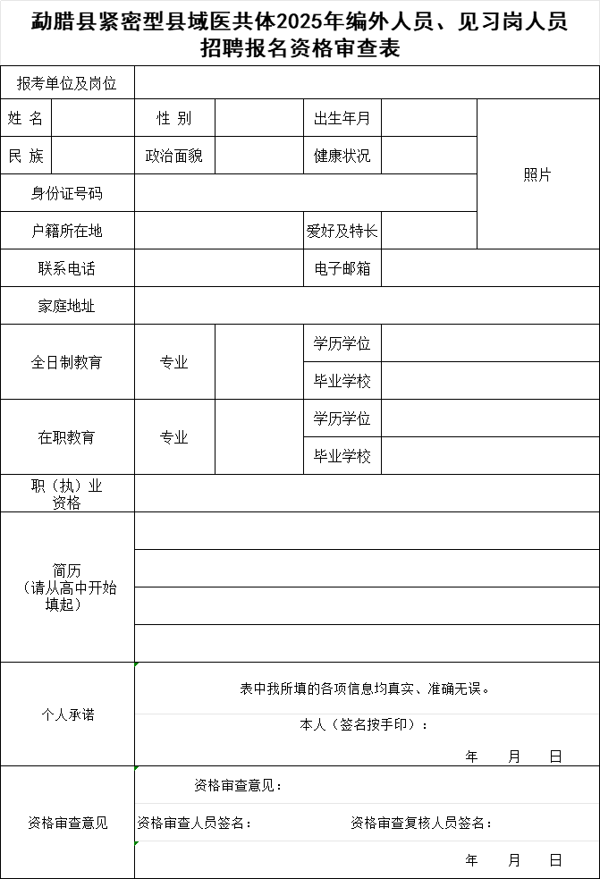 (1)附件1《勐臘縣緊密型縣域醫(yī)共體2025年公開招聘編外人員、見習崗人員報名資格審查表》(貼小一寸近期標準證件照1張);