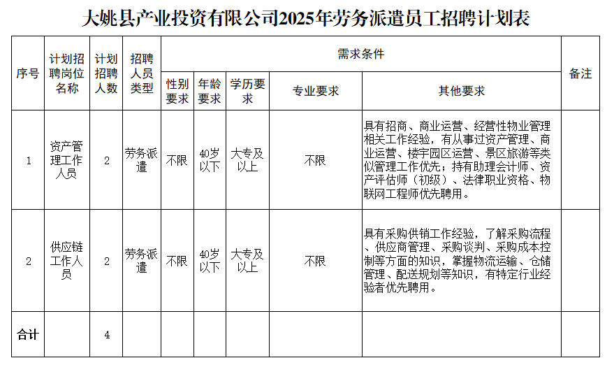 大姚縣產(chǎn)業(yè)投資有限公司全資子公司大姚風(fēng)馳供應(yīng)鏈管理有限公司因業(yè)務(wù)發(fā)展需要,經(jīng)研究,決定面向社會公開招聘勞務(wù)派遣工作人員,現(xiàn)將有關(guān)事項公告如下。