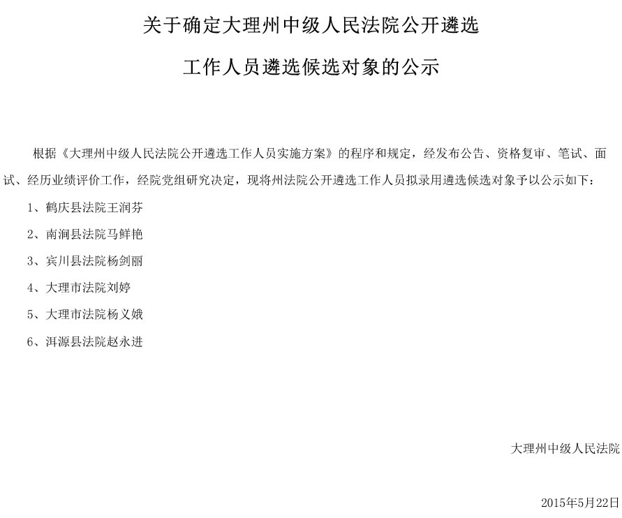 大理州中級人民法院2015年遴選人員擬遴選人員公示