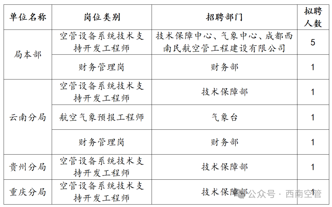 以下招聘崗位工作編制均為西南空管局正式職工。