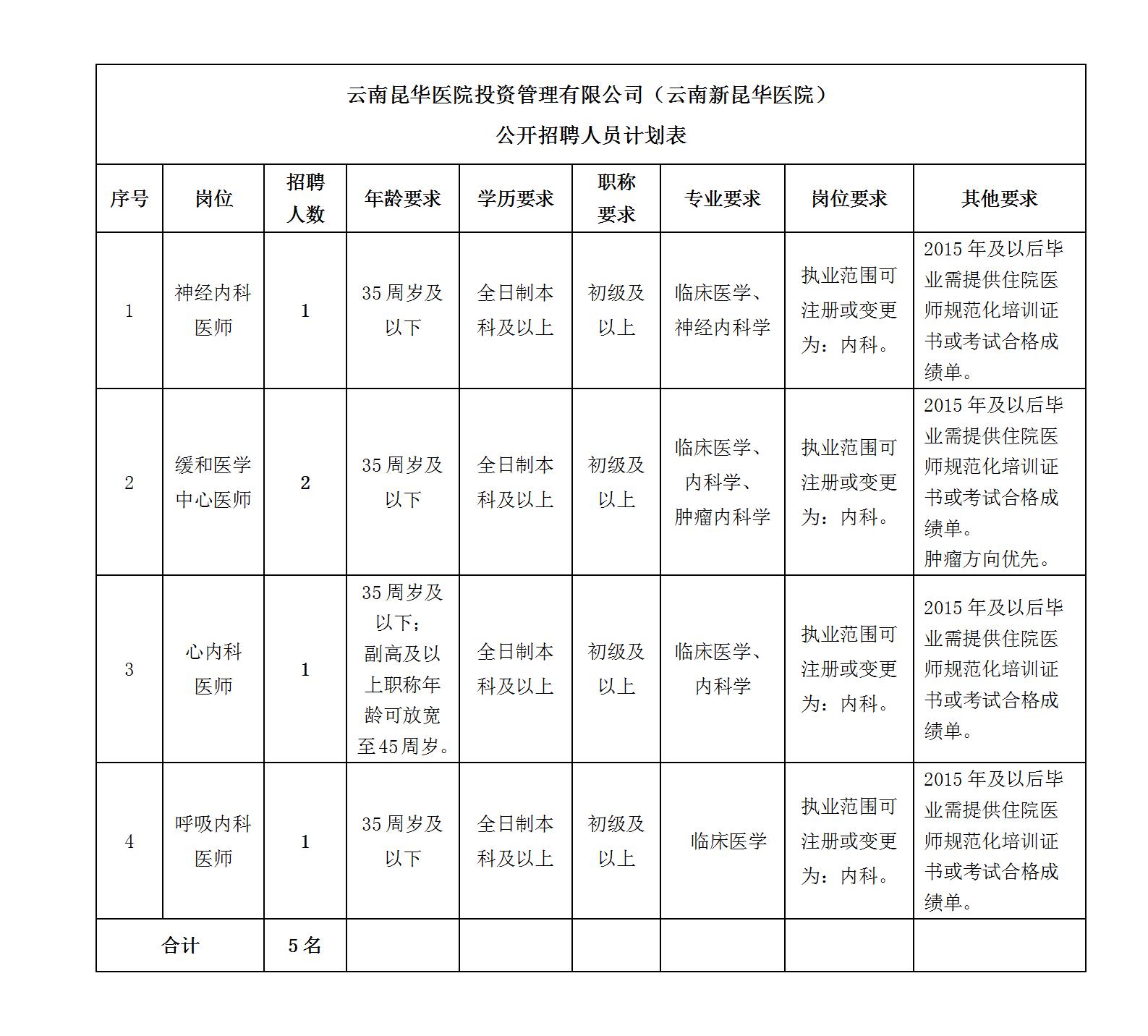 云南昆華醫(yī)院投資管理有限公司(云南新昆華醫(yī)院)本次公開招聘4個崗位,共招聘工作人員5名,具體詳見下表: