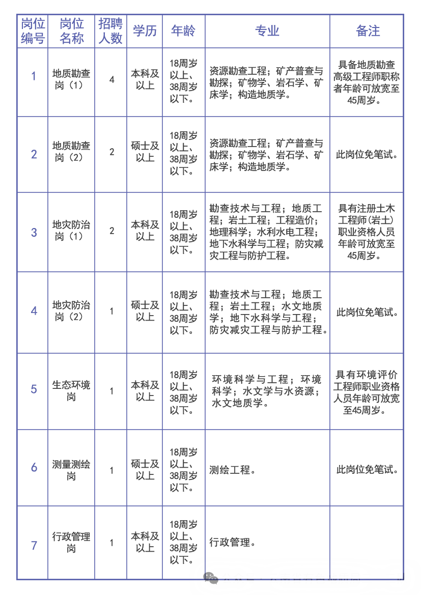 3.年齡計(jì)算截止日期為招聘公告發(fā)布之日,身體健康,能適應(yīng)地質(zhì)勘查野外作業(yè)等工作環(huán)境(條件優(yōu)秀者可放寬年齡限制);