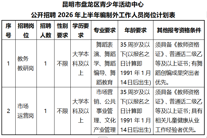 此次面向社會公開招聘昆明市盤龍區(qū)青少年活動中心工作人員2名(含教務(wù)教研崗1名;市場運營崗1名)。