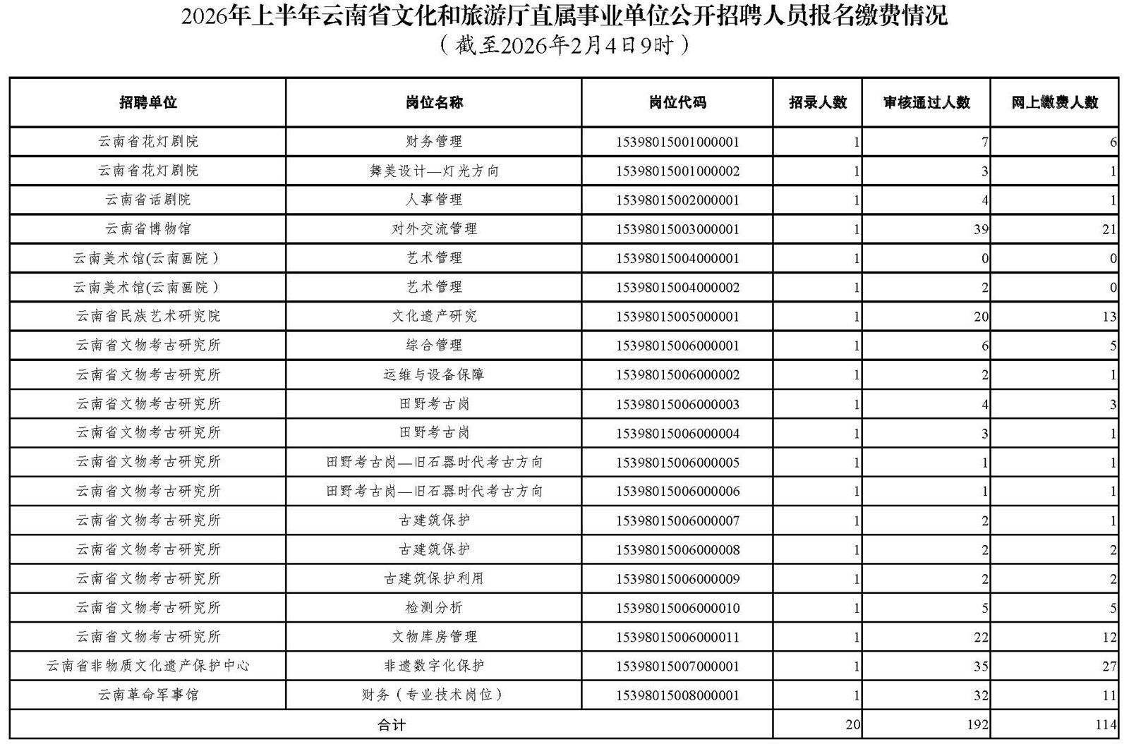 2026年上半年云南省文化和旅游廳直屬事業(yè)單位公開招聘人員報名繳費情況 (截至2026年2月4日9時)