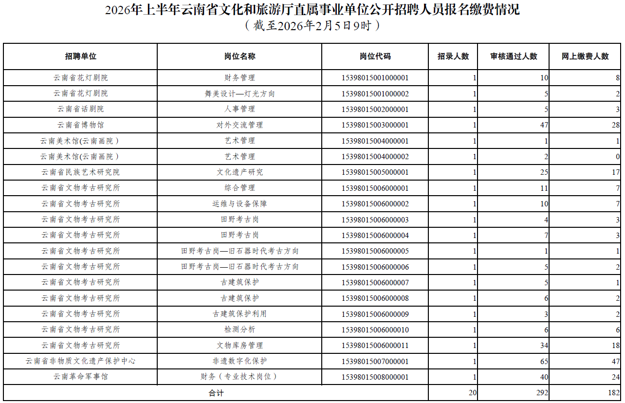 2026年上半年云南省文化和旅游廳直屬事業(yè)單位公開招聘人員報名繳費情況