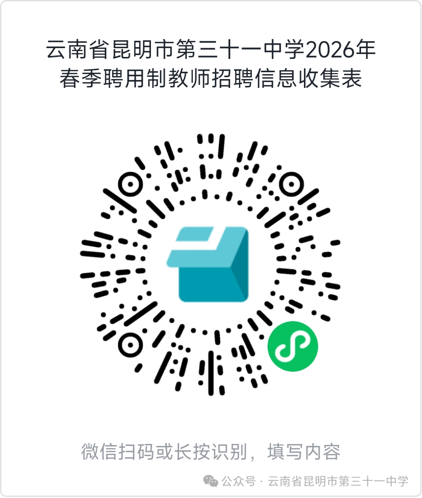 2.報(bào)名方式:本次招聘報(bào)名采取網(wǎng)絡(luò)報(bào)名的方式進(jìn)行,應(yīng)聘人員須在規(guī)定的時(shí)間內(nèi)掃描公告末尾二維碼進(jìn)行網(wǎng)絡(luò)報(bào)名,按《云南省昆明市第三十一中學(xué)2026年春季聘用制教師公開(kāi)招聘公告》報(bào)名要求填寫(xiě)各項(xiàng)信息。網(wǎng)絡(luò)報(bào)名時(shí)間截至2月28日下午18:00。