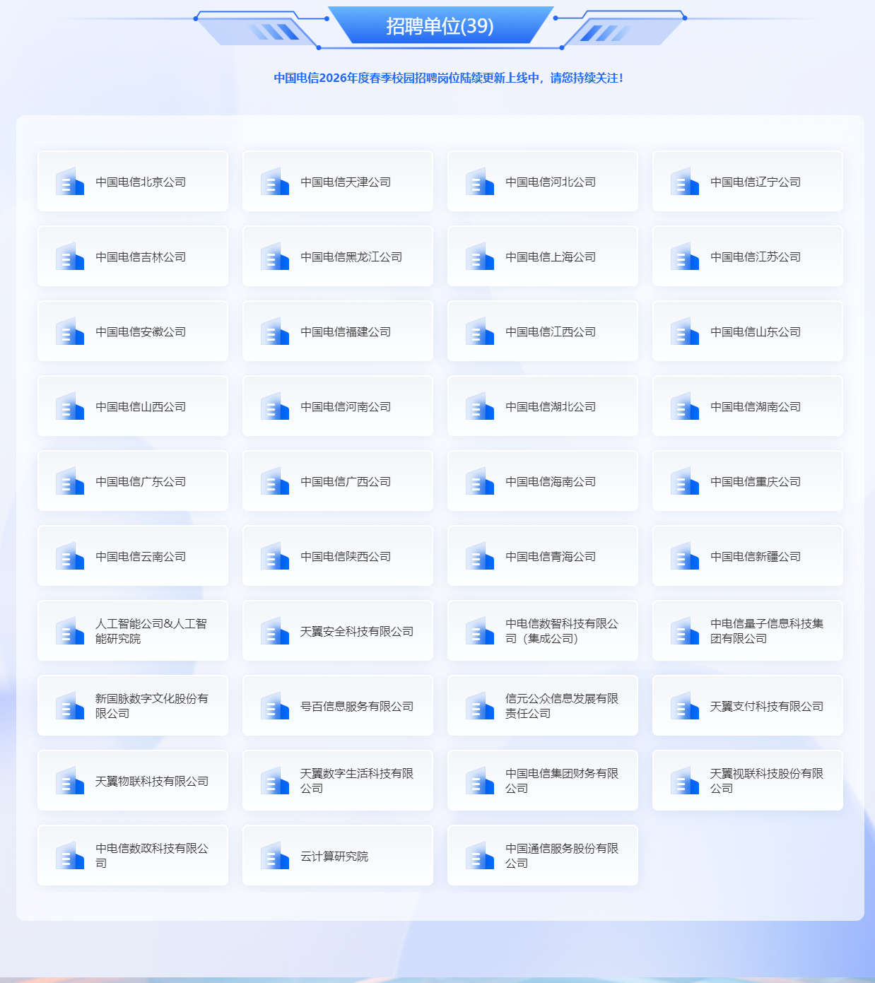 中國電信集團有限公司攜下屬分子公司和專業(yè)機構,正式啟動2026年度春季校園招聘活動,面向國內(nèi)外普通高等院校誠聘英才。