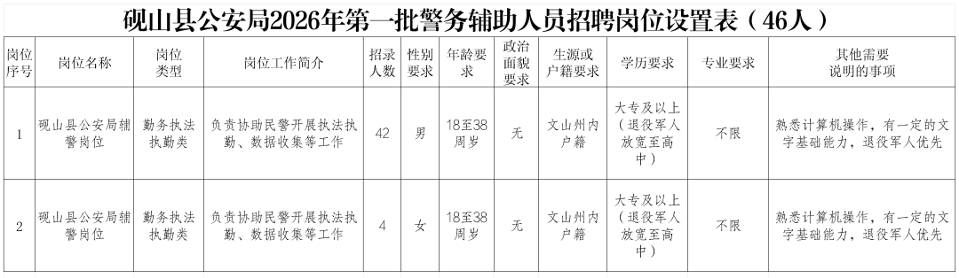硯山縣公安局2026年第一批警務(wù)輔助人員招聘公告