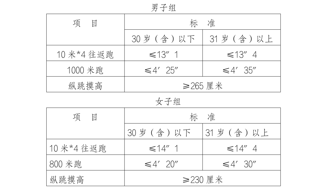 體能測試內(nèi)容及標準參照《公安機關(guān)錄用人民警察體能測評項目和標準(暫行)》(人社部發(fā)〔2011〕48號)執(zhí)行。