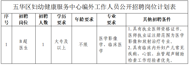 為進一步滿足五華區(qū)婦幼健康服務(wù)中心工作開展需要,按照公開、平等、競爭、擇優(yōu)的原則,委托云南潤邦人力資源服務(wù)有限公司(以下簡稱公司),面向社會公開招聘B超醫(yī)生1名,現(xiàn)將招聘有關(guān)事項公告如下: