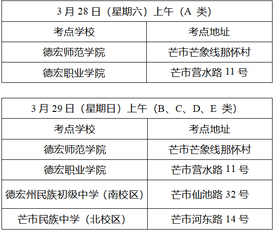 (四)根據(jù)氣象部門(mén)預(yù)測(cè),芒市3月28日晴(13/27℃)、3月29日小雨(13/24℃)。請(qǐng)密切關(guān)注近期天氣變化情況,以免影響考試。