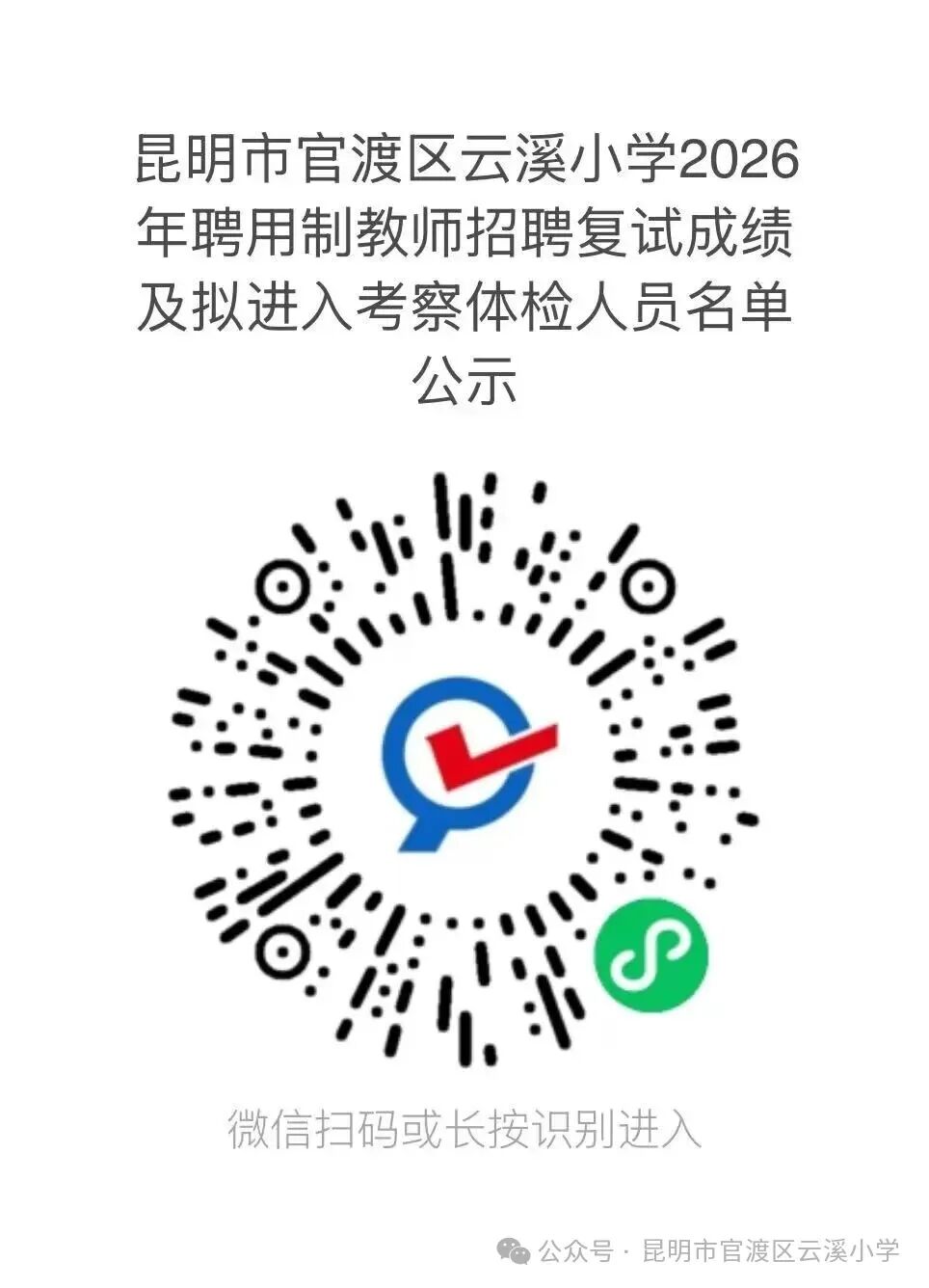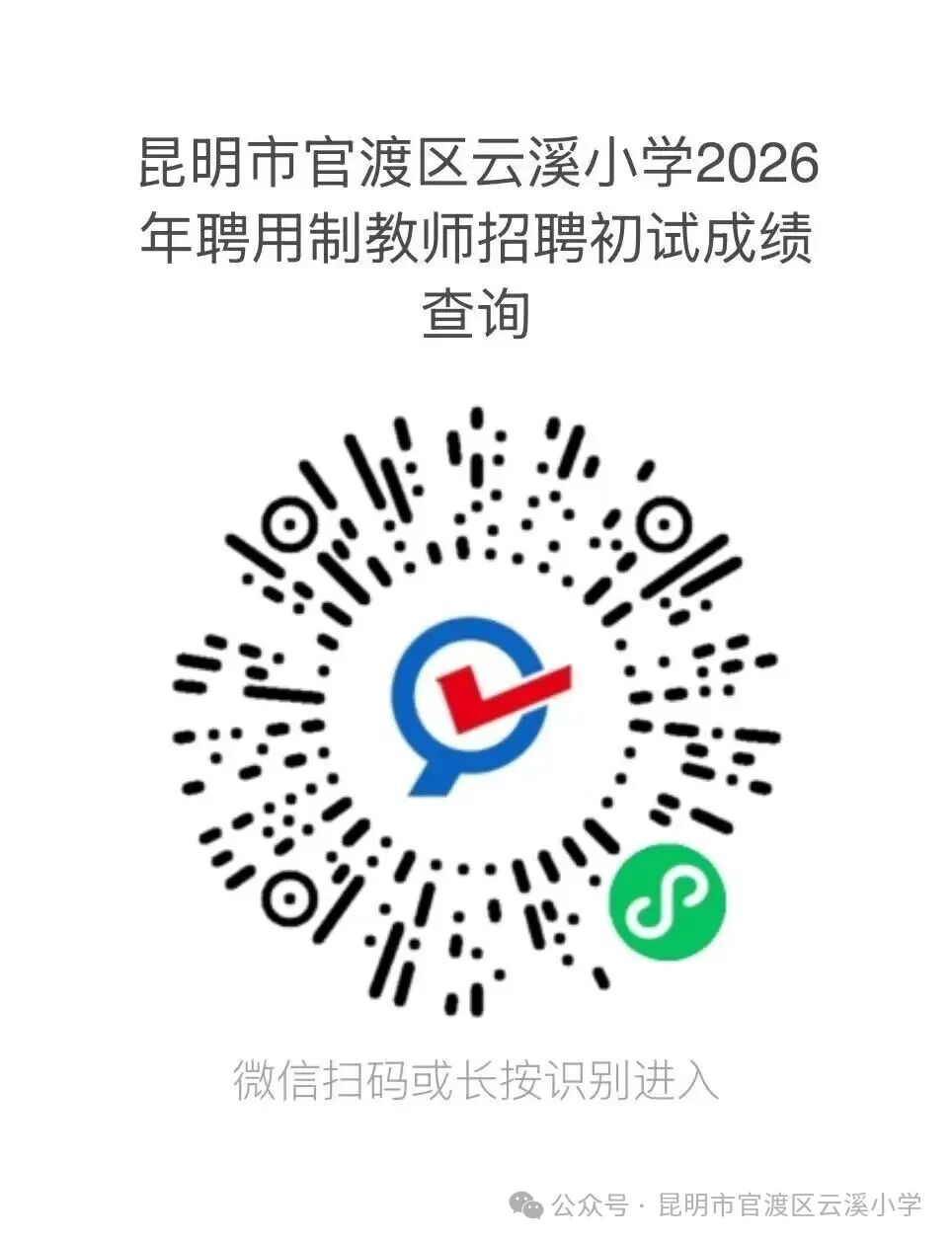 (4)初試成績(jī)查詢:2026年3月31日15:00-19:00,可通過(guò)微信掃碼或長(zhǎng)按識(shí)別下方二維碼,輸入姓名及身份證號(hào)查詢,各崗位按比例1:3(招聘人數(shù)×3)確定進(jìn)入資格復(fù)審及復(fù)試人員(末位同分者一并進(jìn)入)。
